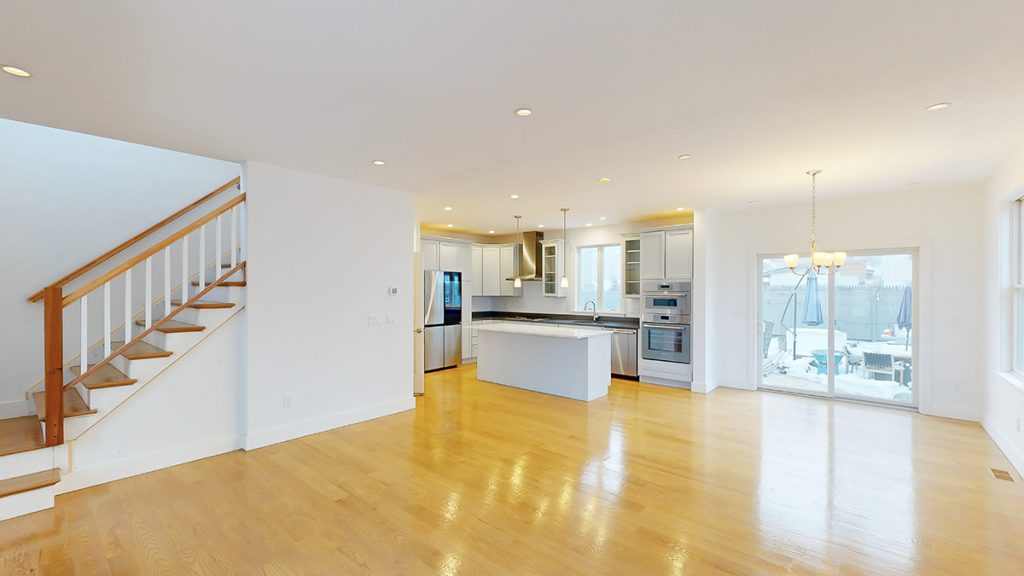 The bright and airy open kitchen and living area create a seamless, connected space designed for modern family living, enhanced by gleaming hardwood floors that run throughout the home. With direct sightlines between the kitchen, dining, and living areas, the layout feels cohesive and functional, making it easy to move between spaces while maintaining a sense of openness.